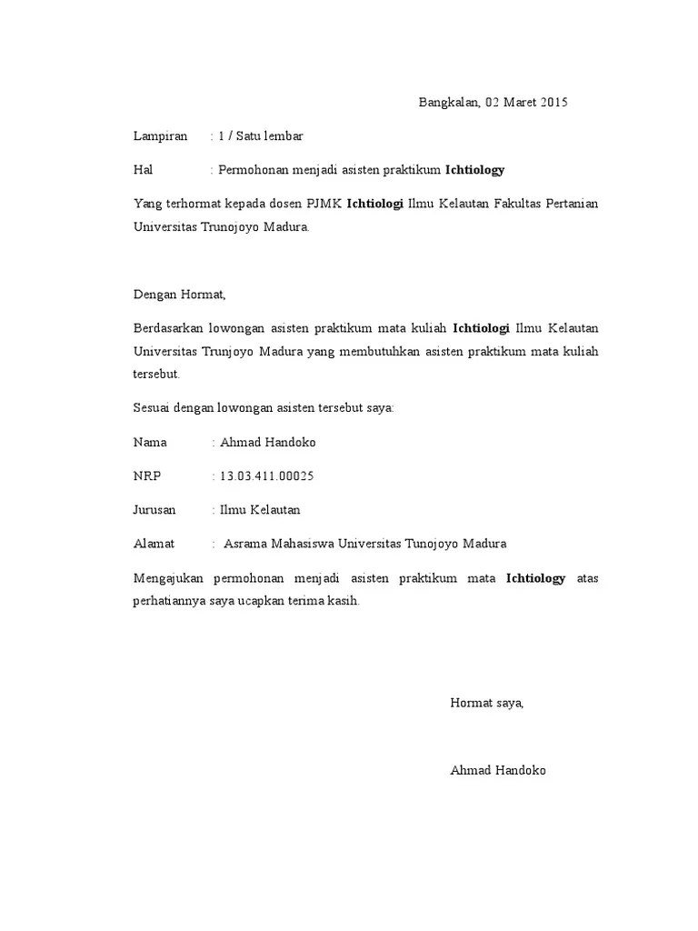Contoh surat lamaran asisten lab . Find out the most recent pictures of contoh . Contoh surat lamaran sebagai asisten laboraturium. 5 surat lamaran pekerjaan dalam bahasa. Inilah contoh surat lamaran kerja .